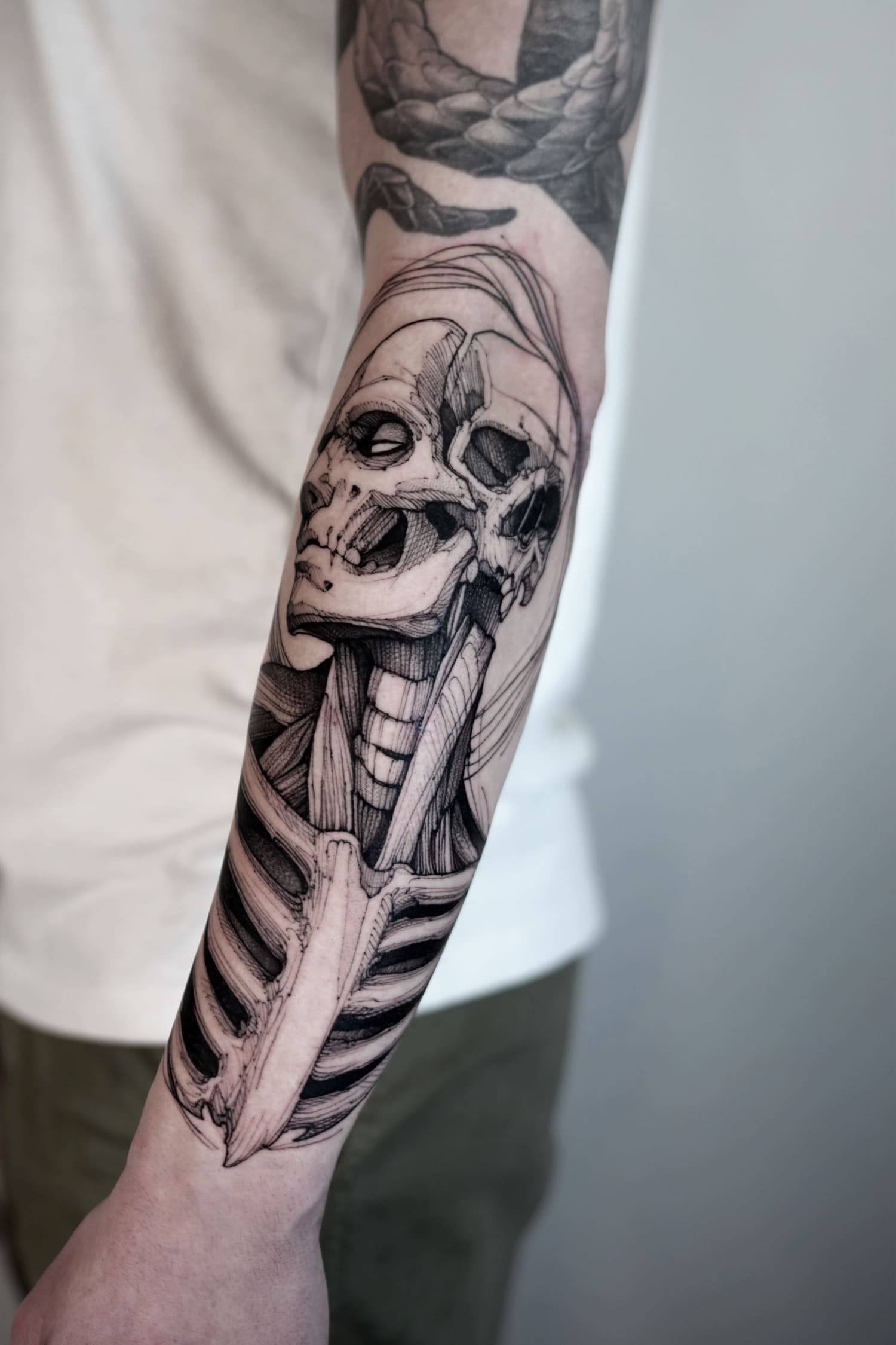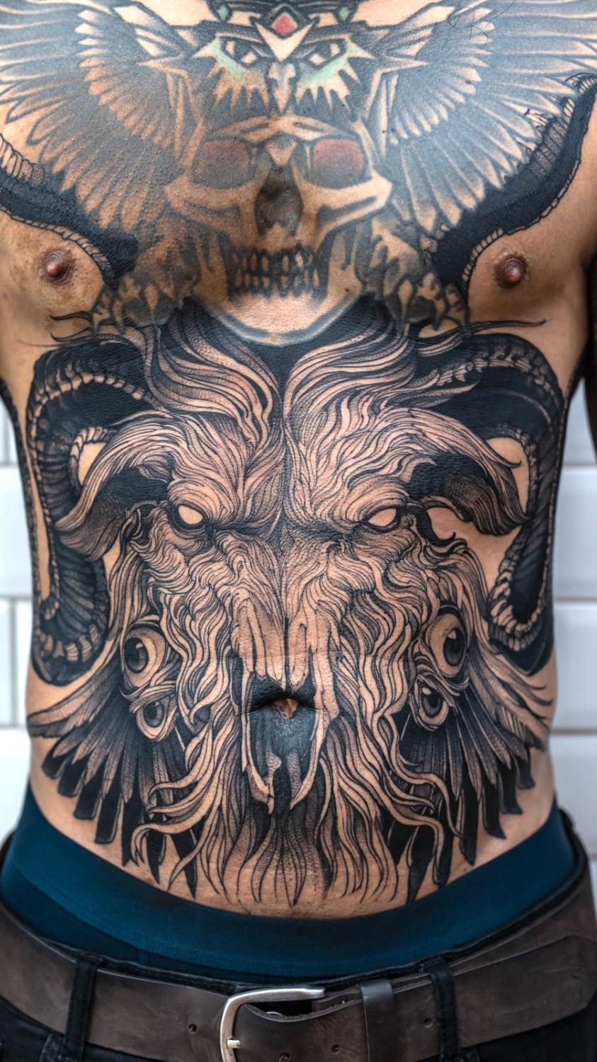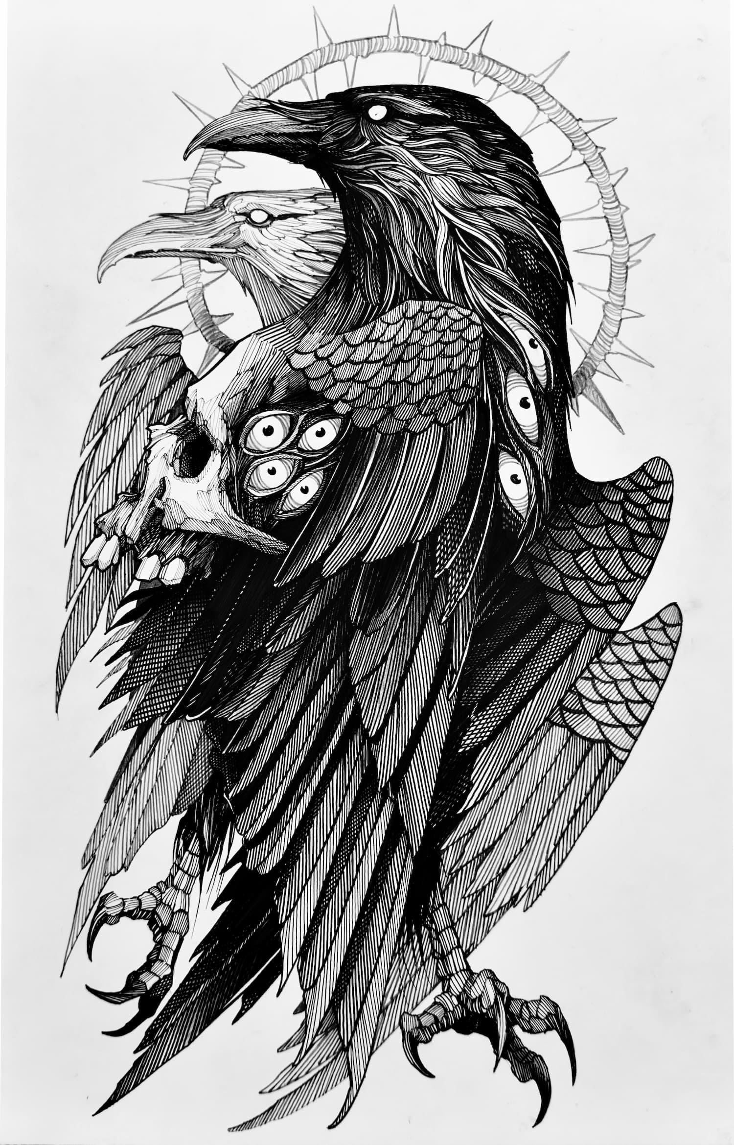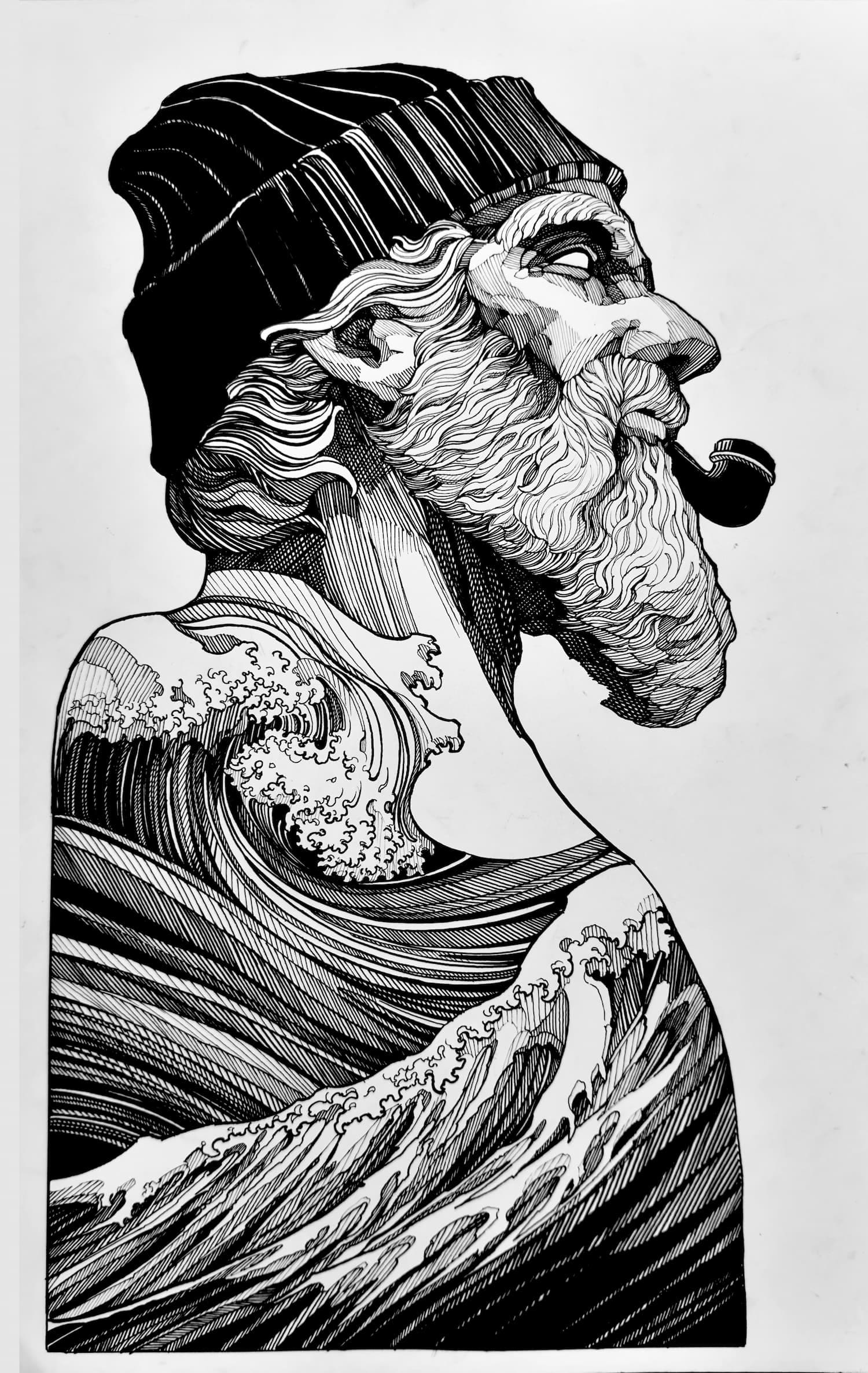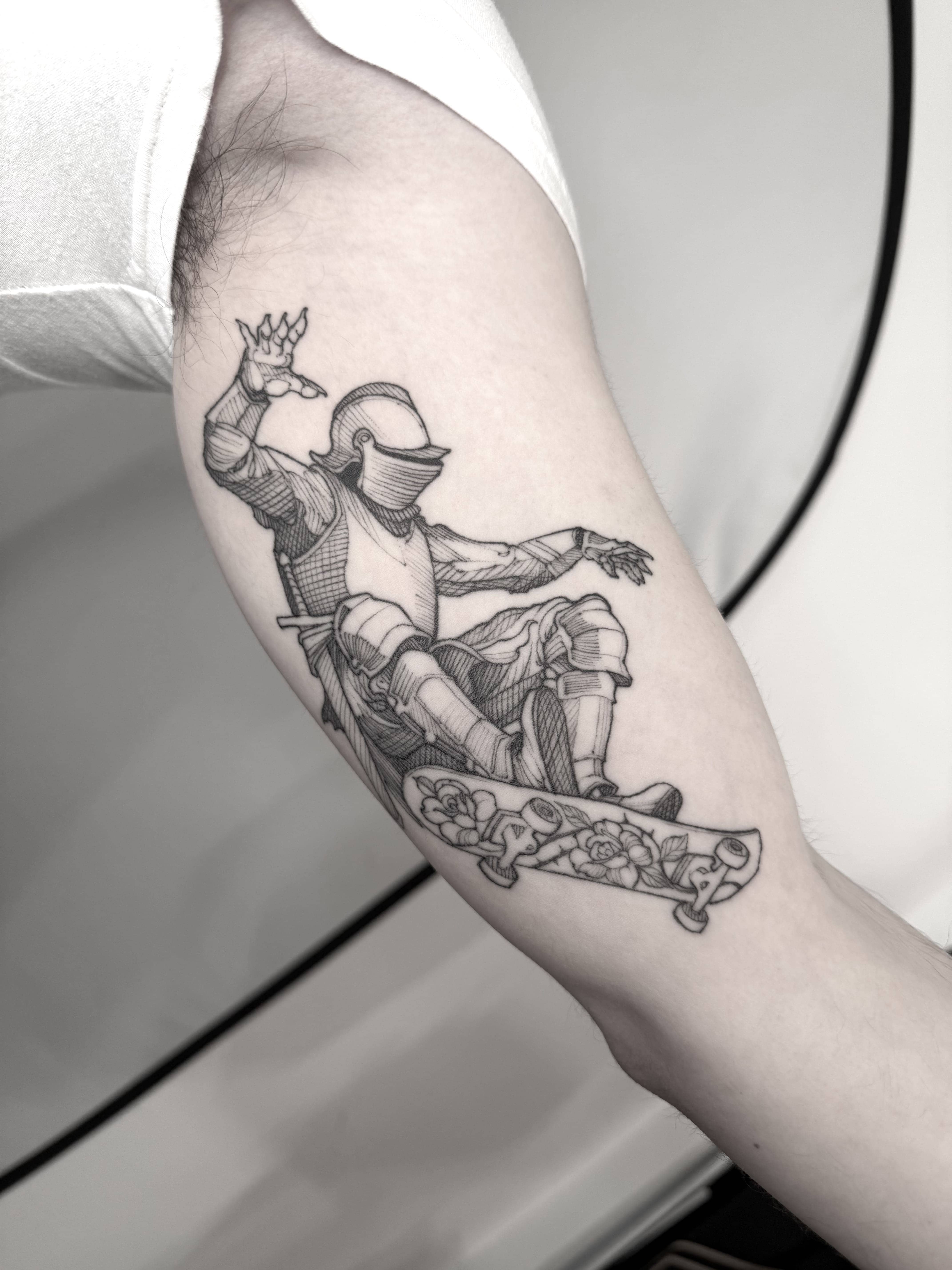 His practice moves between tattooing, illustration, and graphic art, establishing itself not merely as technique, but as a consistent, authorial, and enduring visual language.