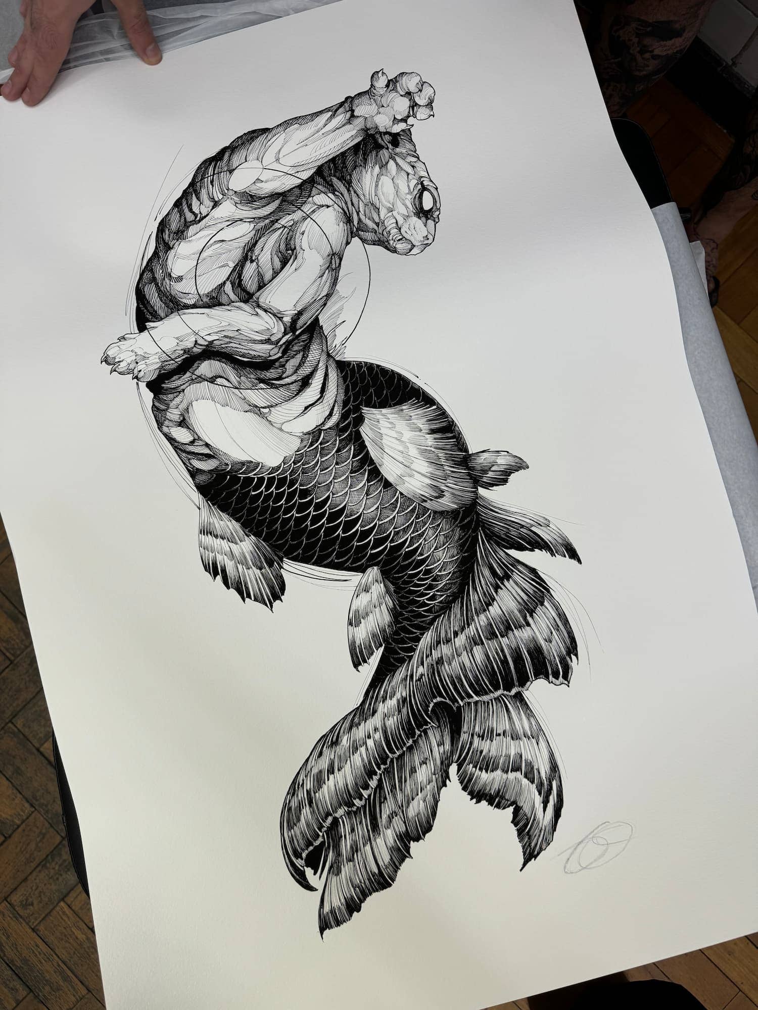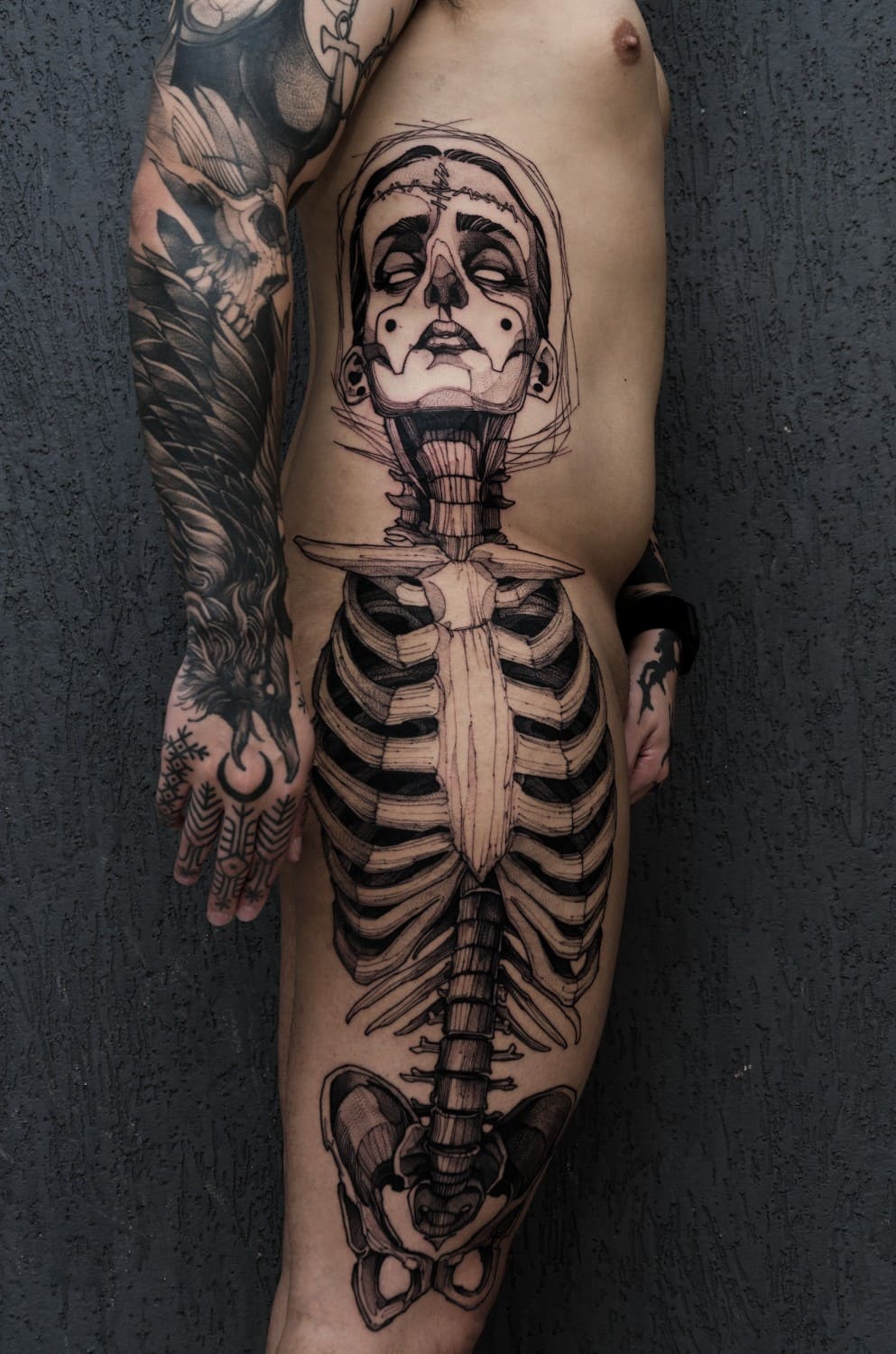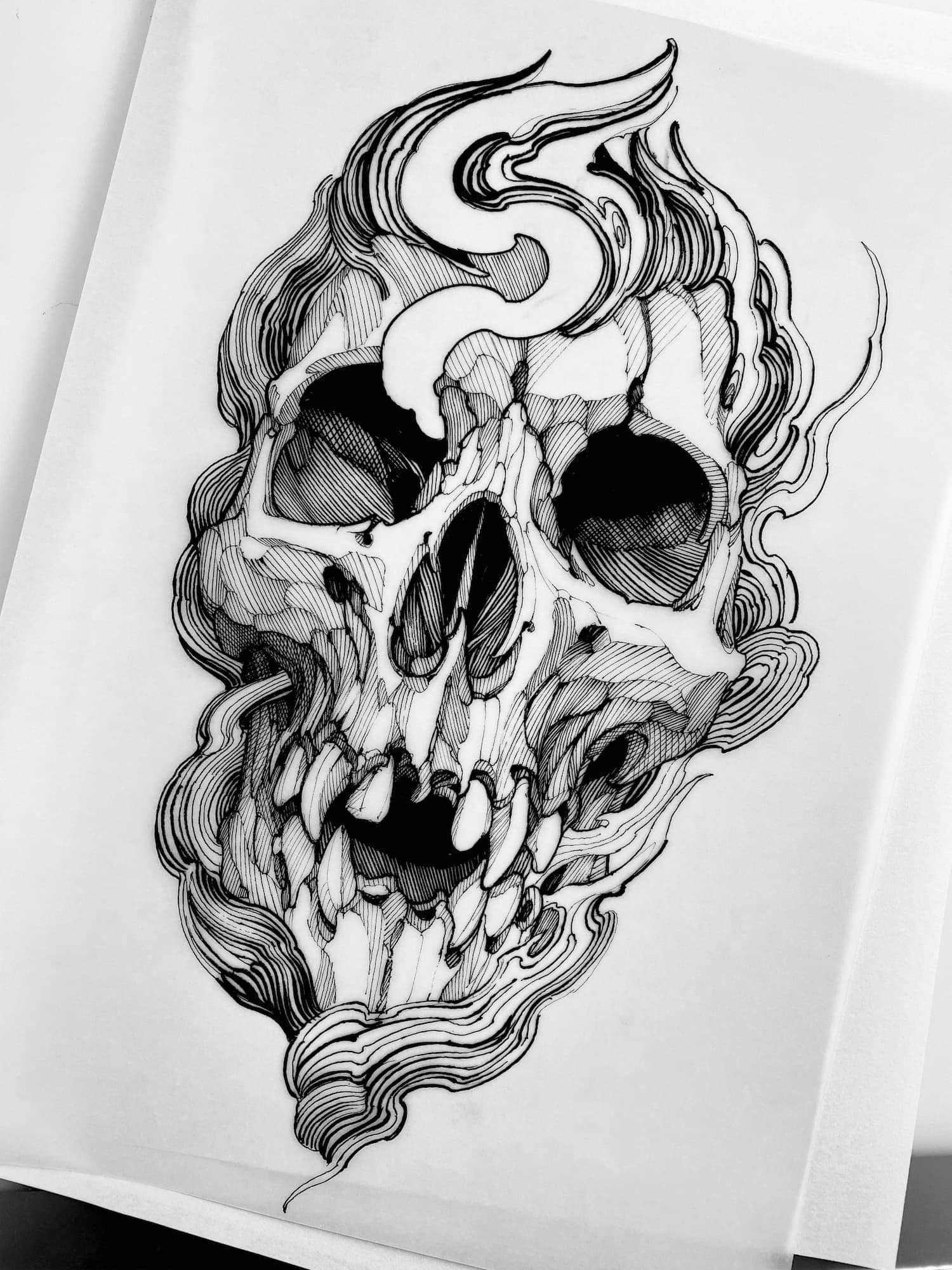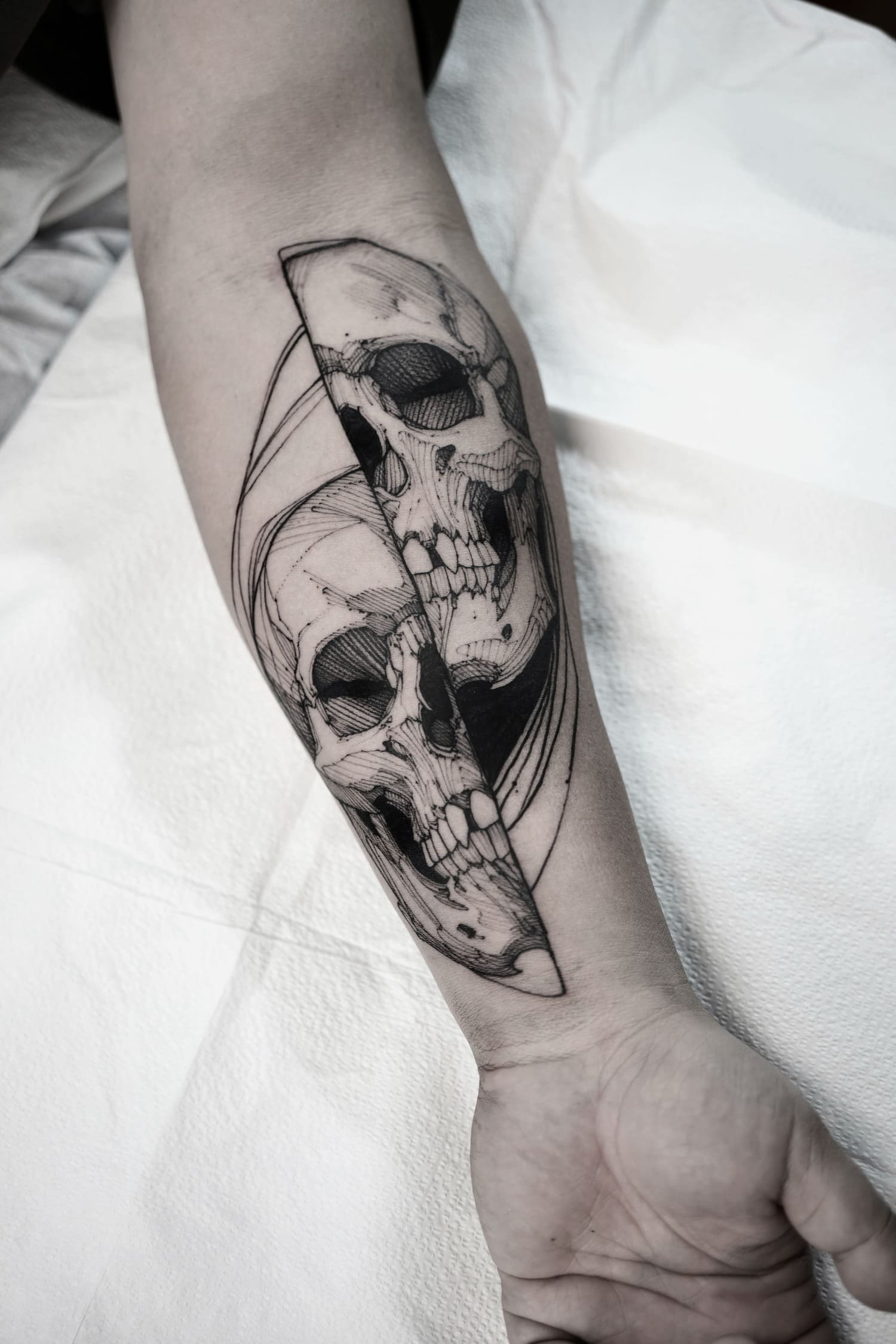 His practice moves between tattooing, illustration, and graphic art, establishing itself not merely as technique, but as a consistent, authorial, and enduring visual language.