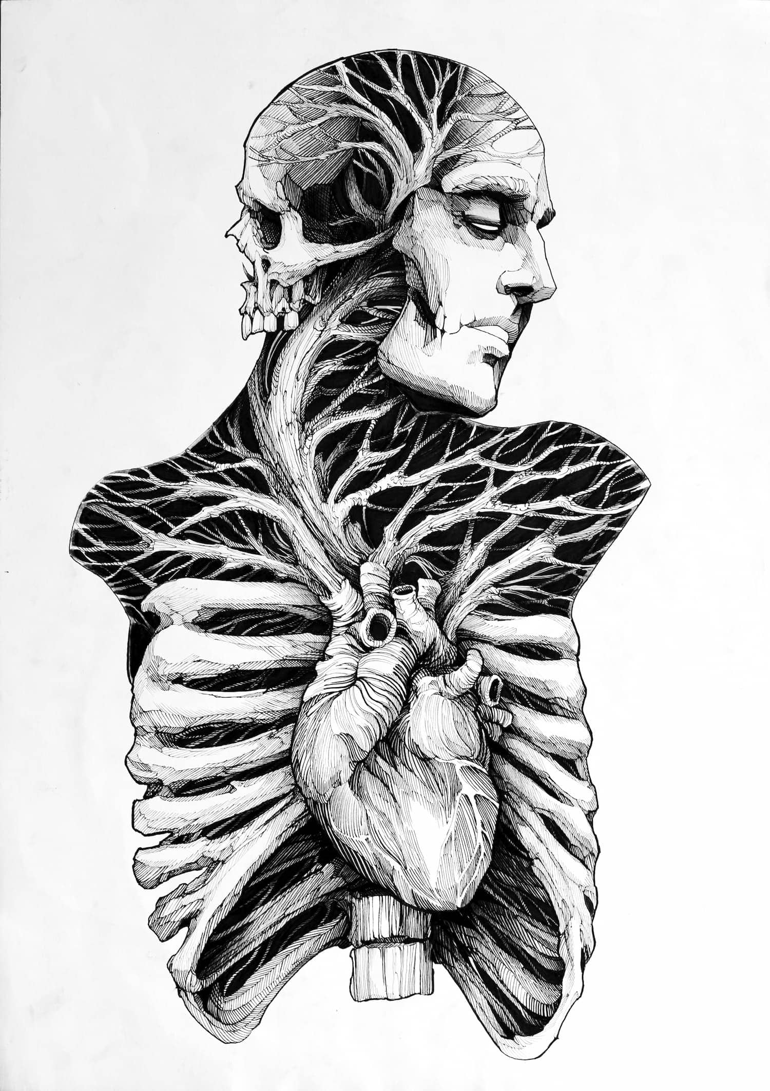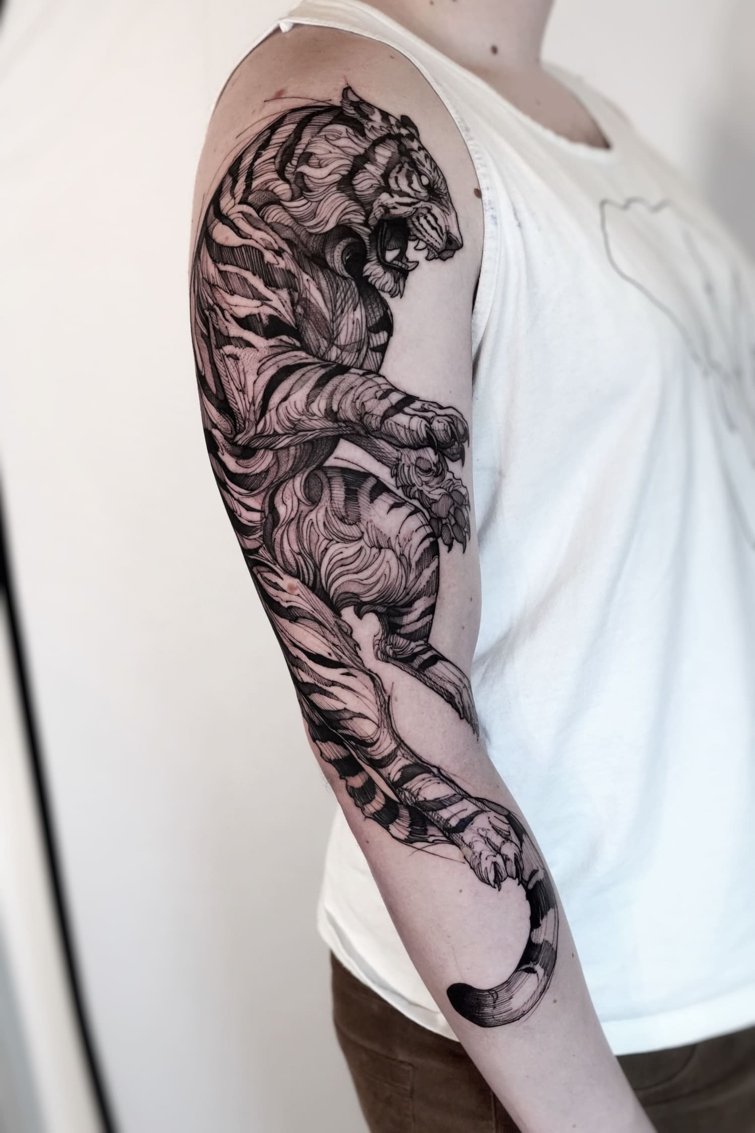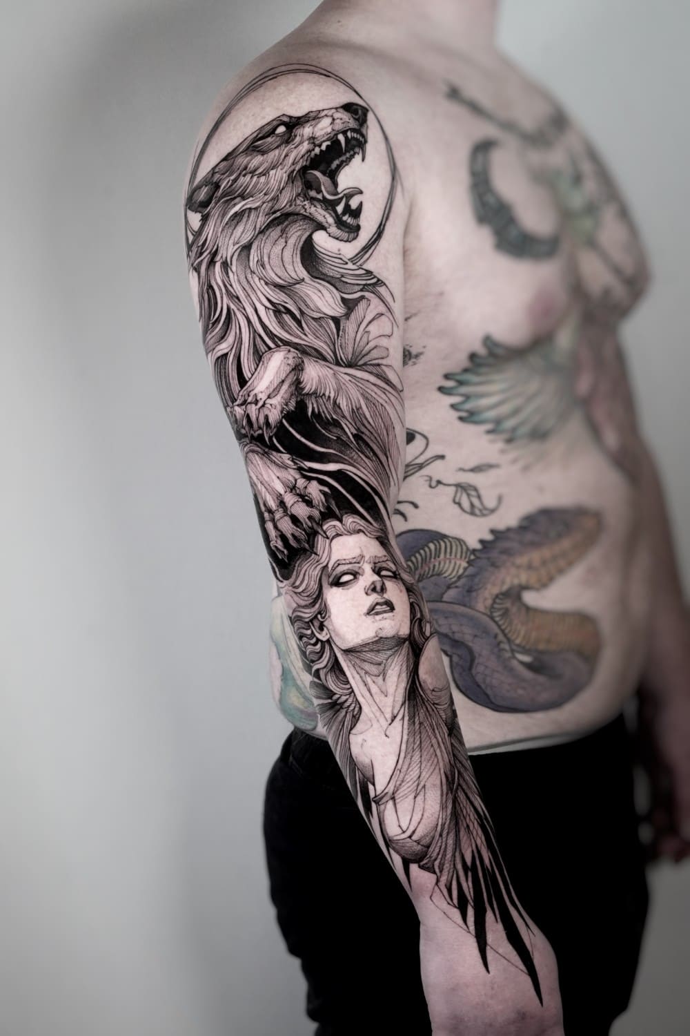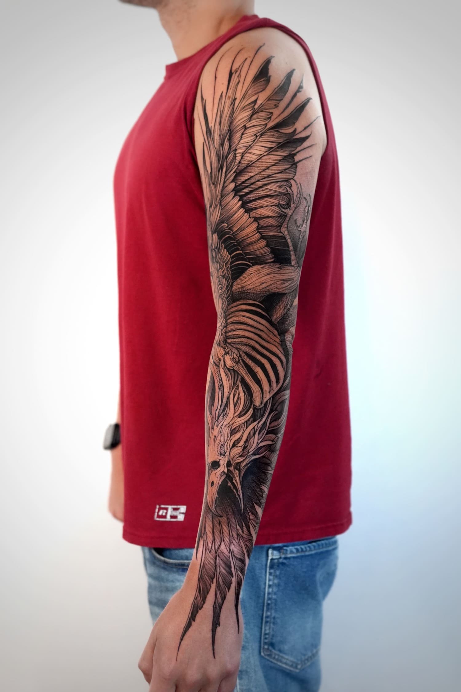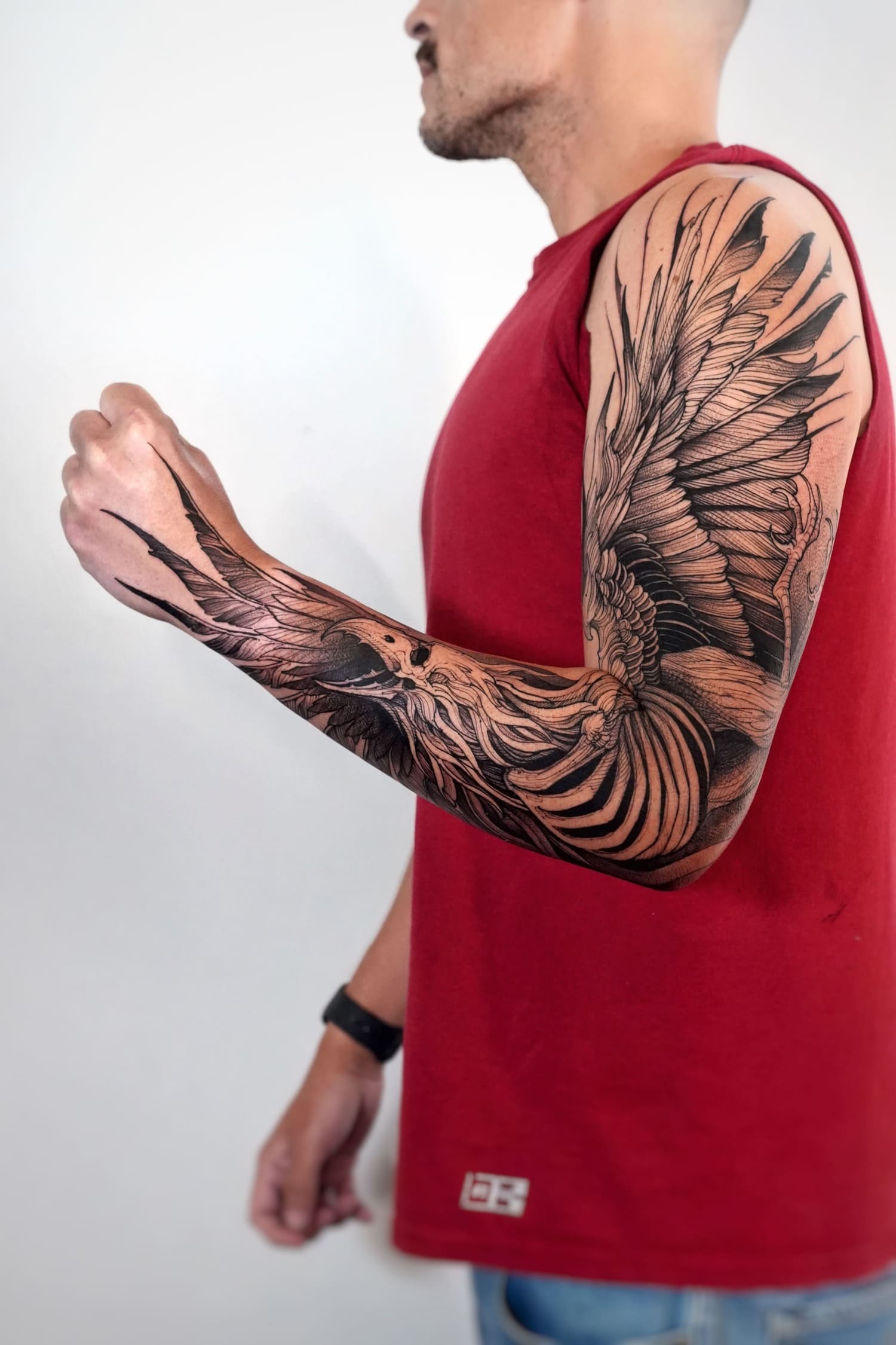 A draftsman by vocation, Fredão was influenced early on by illustration and comic art. Over the years, he refined his practice by working exclusively in black and white, exploring contrast, volume, and dense shadow. His work is defined by solid compositions and striking imagery that, on the skin, evoke the qualities of drawing on paper or canvas—preserving the gesture, texture, and immediacy of freehand work.