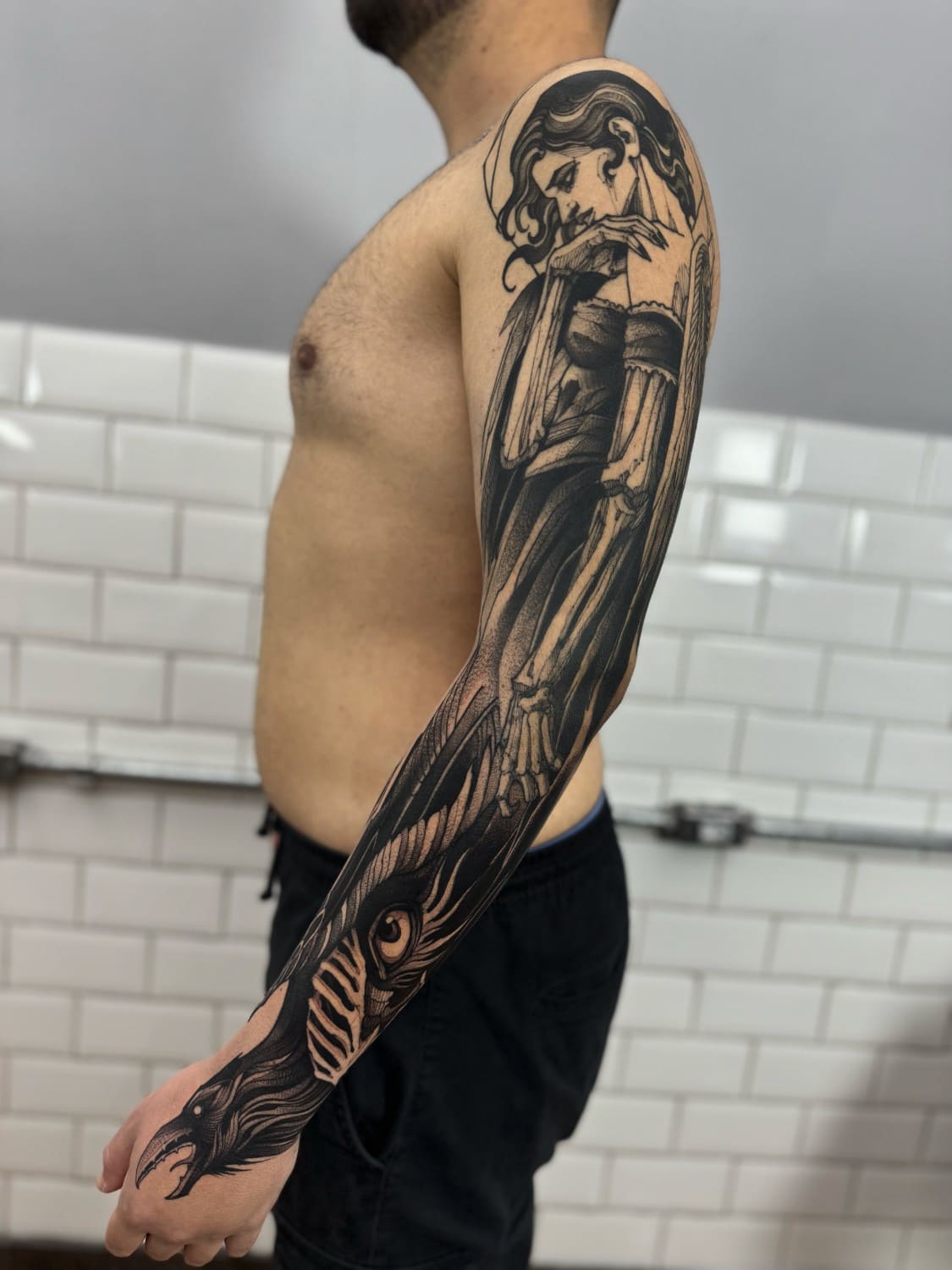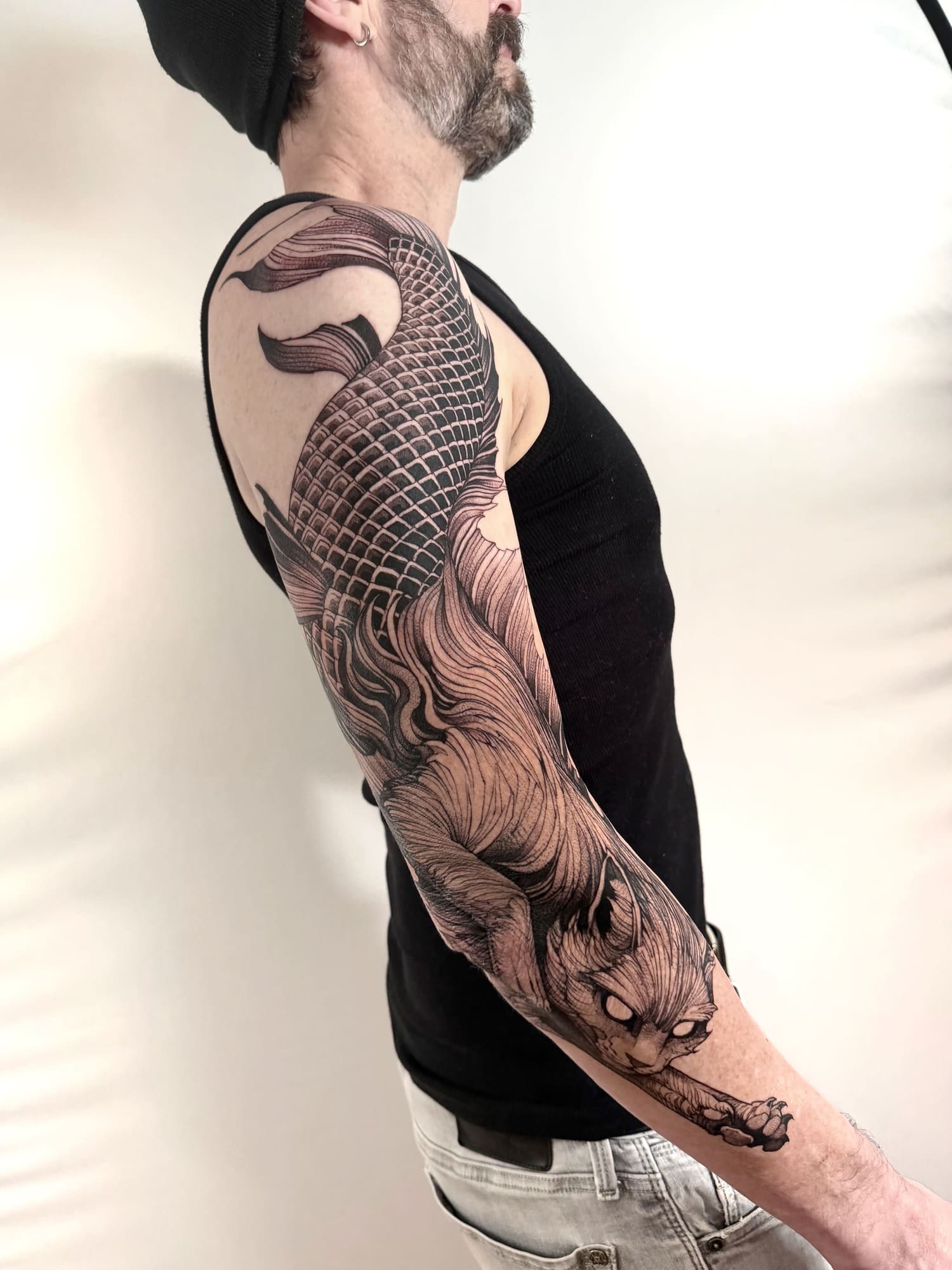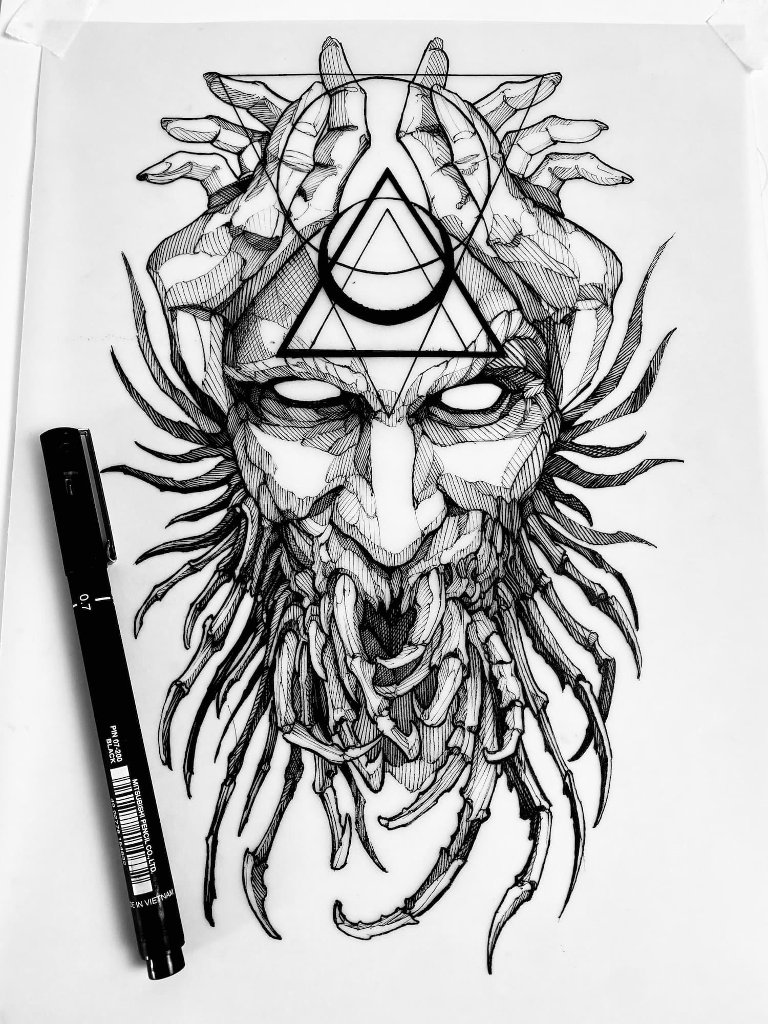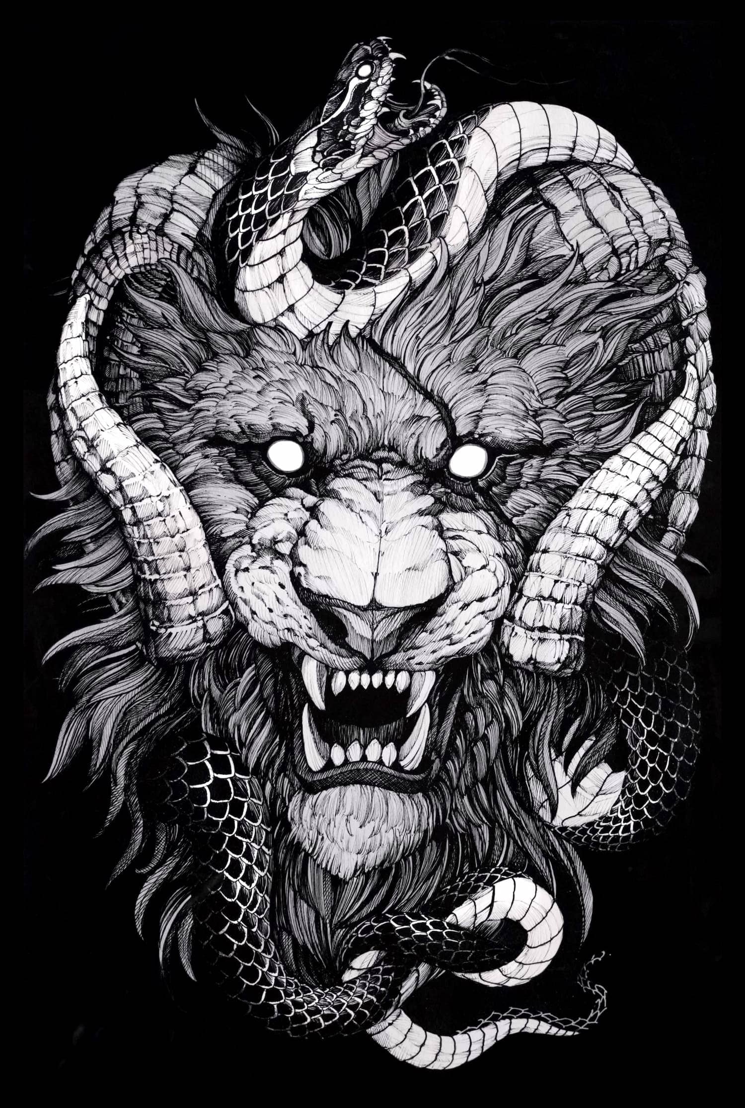 A draftsman by vocation, Fredão was influenced early on by illustration and comic art. Over the years, he refined his practice by working exclusively in black and white, exploring contrast, volume, and dense shadow. His work is defined by solid compositions and striking imagery that, on the skin, evoke the qualities of drawing on paper or canvas—preserving the gesture, texture, and immediacy of freehand work.